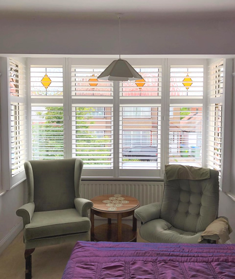 We built the design around these stain glassed patterned windows and matched the shutter lines with the lining of the windows, an important part of our bespoke designs. We used a silent tilt rod system to create a modern look for the customer, they can adjust the louvres by touch!